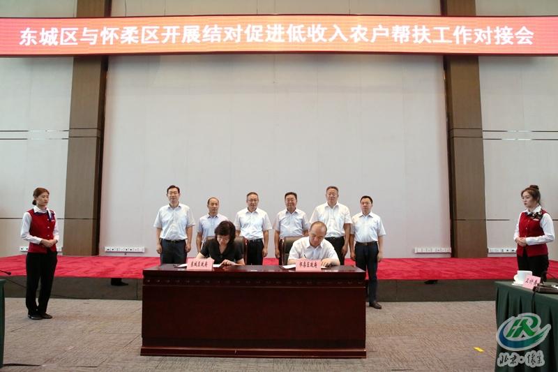 与会人员观看了怀柔区宣传片,分别听取了怀柔、东城两区区情、低收入农户帮扶工作情况及下步工作思路。东城区东华门街道、朝阳门街道分别与我区雁栖镇、琉璃庙镇签订结对帮扶协议;东城区四家企业分别与我区雁栖镇八道河村、琉璃庙镇碾子湾村、渤海镇铁矿峪村、九渡河镇东宫村签订低收入结对帮扶协议。